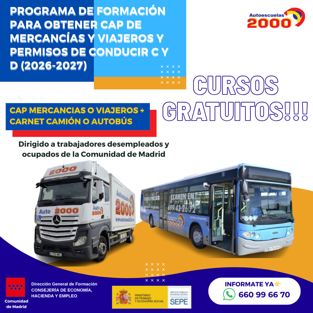 La Comunidad de Madrid en estos momentos está centrada en uno de sus objetivos prinicipales, La Estrategia Madrid por el Empleo 2025-2027, que tiene como finalidad elevar el grado de empleabilidad de la población desempleada y ocupada en la Comunidad de Madrid por medio de la habilitación profesional (CAP de mercancías y viajeros ) con permiso de conducción C y D, en especial para quienes tienen mayores dificultades de mantenimiento delempleo o de inserción laboral. Esta convocatoría pretende formar con estos itinerarios, a 1.200 alumnos durante 2026 y 2027